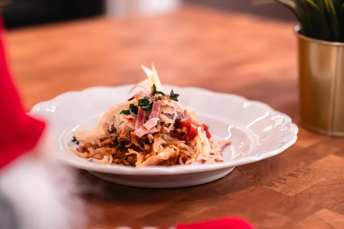 A gerslit felhasználás előtt legalább fél órát áztassuk be meleg vízbe, majd szűrjük le. Lábasban készítjük el a káposztát. A lábas aljára kevés vizet öntünk, lerakjuk az apróra vágott bacon felével, majd az alábbi rétegek következnek: – savanyú káposzta – pulykacomb – karikára vágott zöldségek (vöröshagyma, zöldpaprika, paradicsom) – lecsepegtetett gersli – savanyú káposzta – füstölt pulykacomb – karikára vágott zöldségek – savanyú káposzta –, a teteje az apróra vágott baconszeletekkel zárul. Felöntjük annyi vízzel, hogy éppen ellepje. Sót nem kell használni, mert a savanyú káposzta és a füstölt hús is sós. Kis fokozaton 3-4 órán át főzzük.