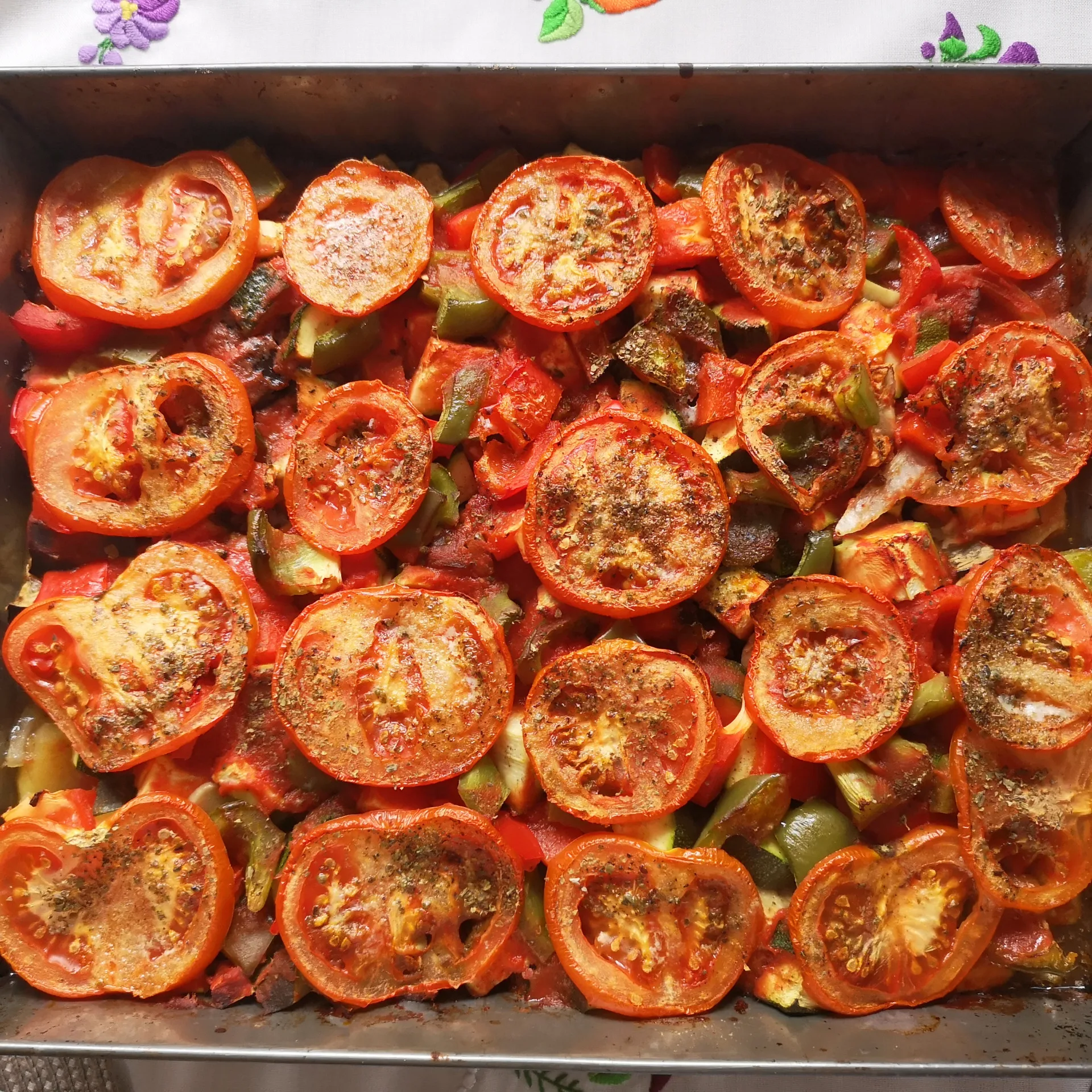 A burgonyát és a hagymát megpucoljuk, a padlizsánt, a cukkinit, a paradicsomot és a paprikát megmossuk (héját rajta hagyjuk). A krumplit, paradicsomokat, padlizsánt, cukkinit és a hagymát karikákra vágjuk, a paprikát felcsíkozzuk.Egy kisebb méretű tepsi aljára kevés olajat öntünk, ebbe tesszük a zöldségeket összekeverve, megszórjuk a fűszerekkel, meglocsoljuk a paradicsomlével, rákerül a felkarikázott paradicsom szépen eloszlatva, majd megszórjuk egy kis őrölt majoránnával.Nagyon halvány szeletke vajat teszünk a tetejére, és bekerül a sütőbe. Közepes lángon 1 órán át hagyjuk sülni.