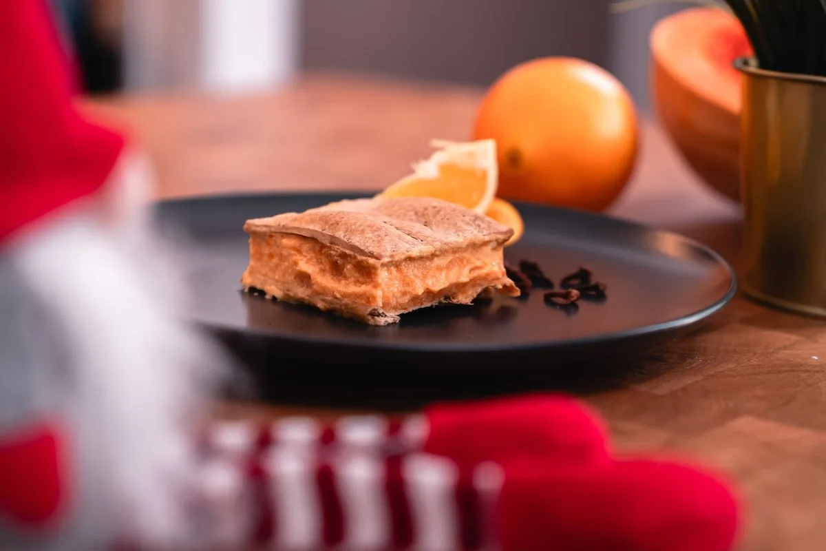 A krémhez megfőzzük a pudingot, ha kihűlt, hozzáadjuk a megfőtt és leturmixolt sütőtököt és édesburgonyát, majd a felvert habtejszín. A teljes kiőrlésű leveles tésztának a felét feldaraboljuk a tepsiben 10 egyenlő részre. A másik felét egyben hagyjuk, így sütjük ki. Ha kihűlt, az egyben maradt tésztalapra rákenjük a krémet, arra pedig a külön kis tésztaszeletek. Hagyjuk a hűtőben dermedni mielőtt felszeletelnénk.